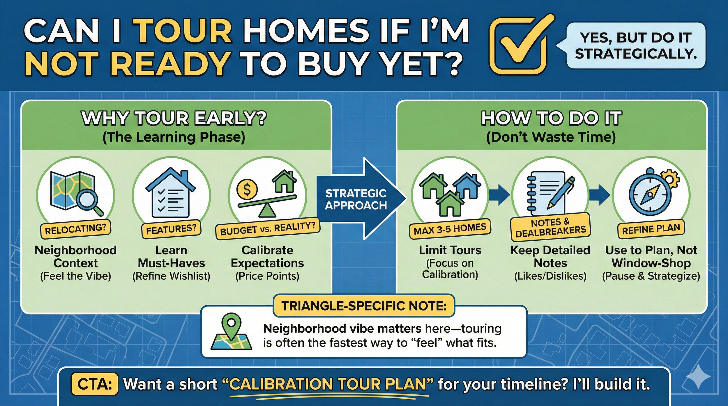 Yes—touring homes before you’re ready can be smart if you’re using it to learn price points, neighborhoods, and must-haves. The key is being clear about your timeline and touring with a plan.