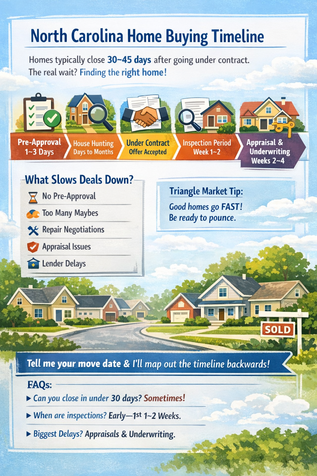 Most NC home purchases close in 30–45 days once under contract. Here’s the full buying timeline from pre-approval to keys.