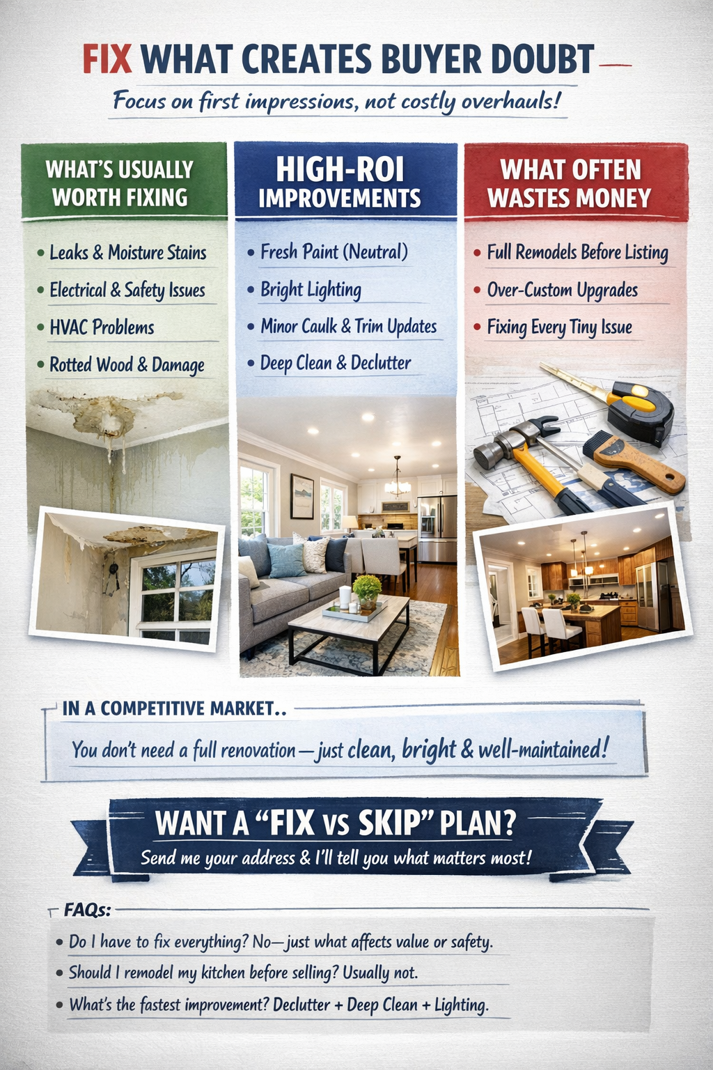 Fix what creates buyer doubt: safety issues, visible deferred maintenance, and anything that signals “this home wasn’t cared for.” Skip expensive projects with weak return and focus on what improves first impressions.